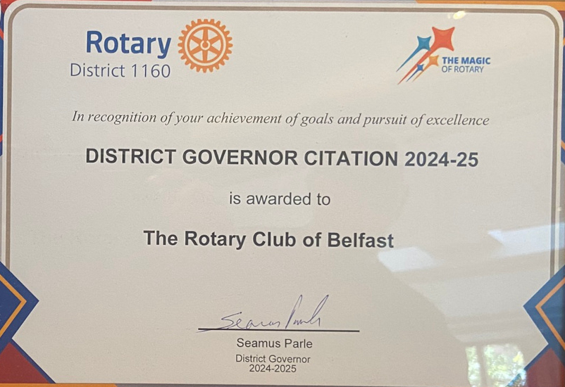 The Rotary Club of Belfast is presented a certificate in its appreciation for its financial support for the Club's support for End Polio Now: Countdown to History Campaign. Together we will fulfil our promise to the children of the world and eradicate Polio.Rotary Foundation Recognition 2022-23