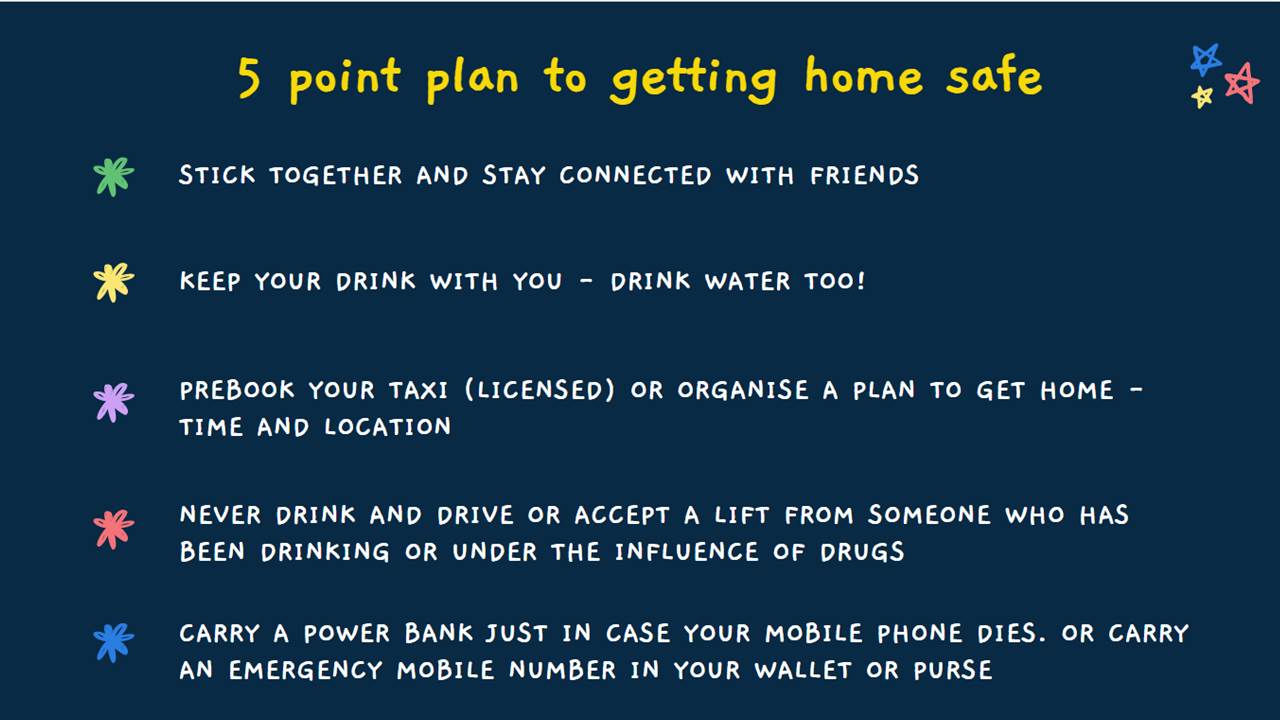 Stuart particularly recommended their 5 point plan for getting home safely and asked members to pass it on to sons, daughters and grandchildren.