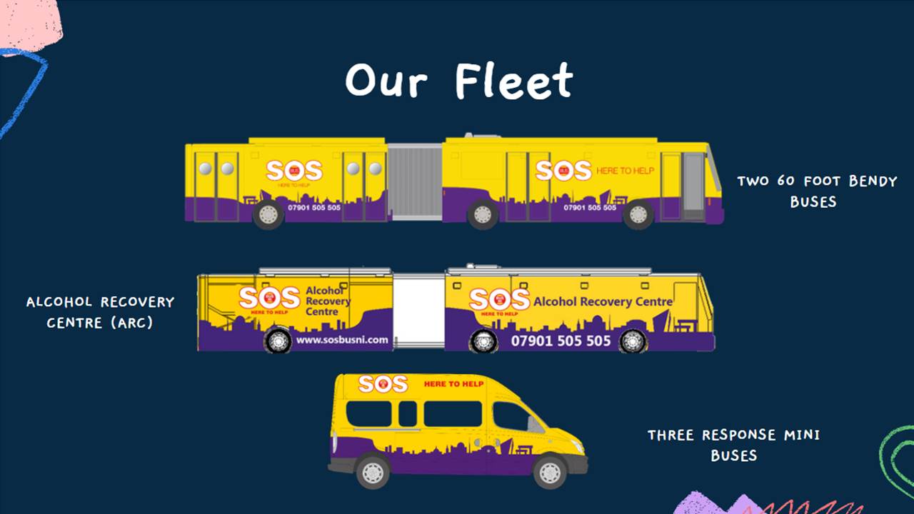 • SOS slide 4their yellow coloured buses are iconic parked on the streets of Belfast and their mini buses provide not only a speedy response to help but also can provide transport to hospital or a place of safety which helps to reduce the pressures on the emergency services and freeing up ambulances