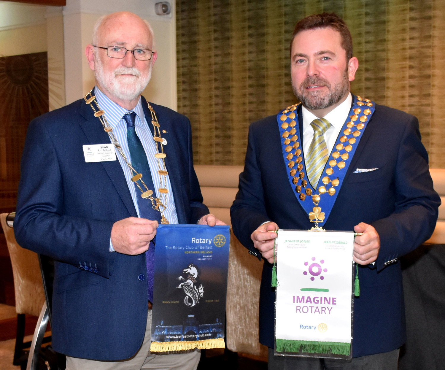 The Club was delighted to welcome Rotary Ireland District Governor Sean Fitzgerald to the Club Meeting Monday 17 October. He exchanged banners with President Steven Costello and his well-received address centred on the Rotary International President Jennifer Jones's theme for the year Imagine Rotary by looking at how it can motivate clubs' activity to increase membership, grow and increase Rotary's impact. He concluded by urging members to enjoy Rotary, have fun and keep imagining.