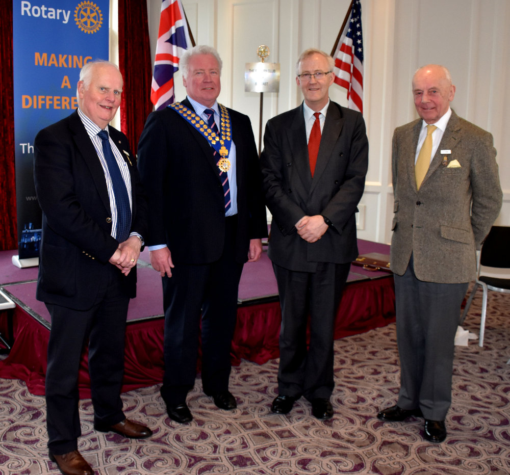 Deputy Lord Lieutenant for the City of Belfast Colonel Mark Campbell CBE in a most interesting address to the Club Monday 11 April 2016 spoke on the work of a Deputy Lieutenant in Belfast highlighting its interesting and wide ranging responsibility. He is pictured 2nd right with President Ronnie and 2 of the Club's 4 Deputy Lieutenants Eric Rainey (far left) and CT Hogg (far right).