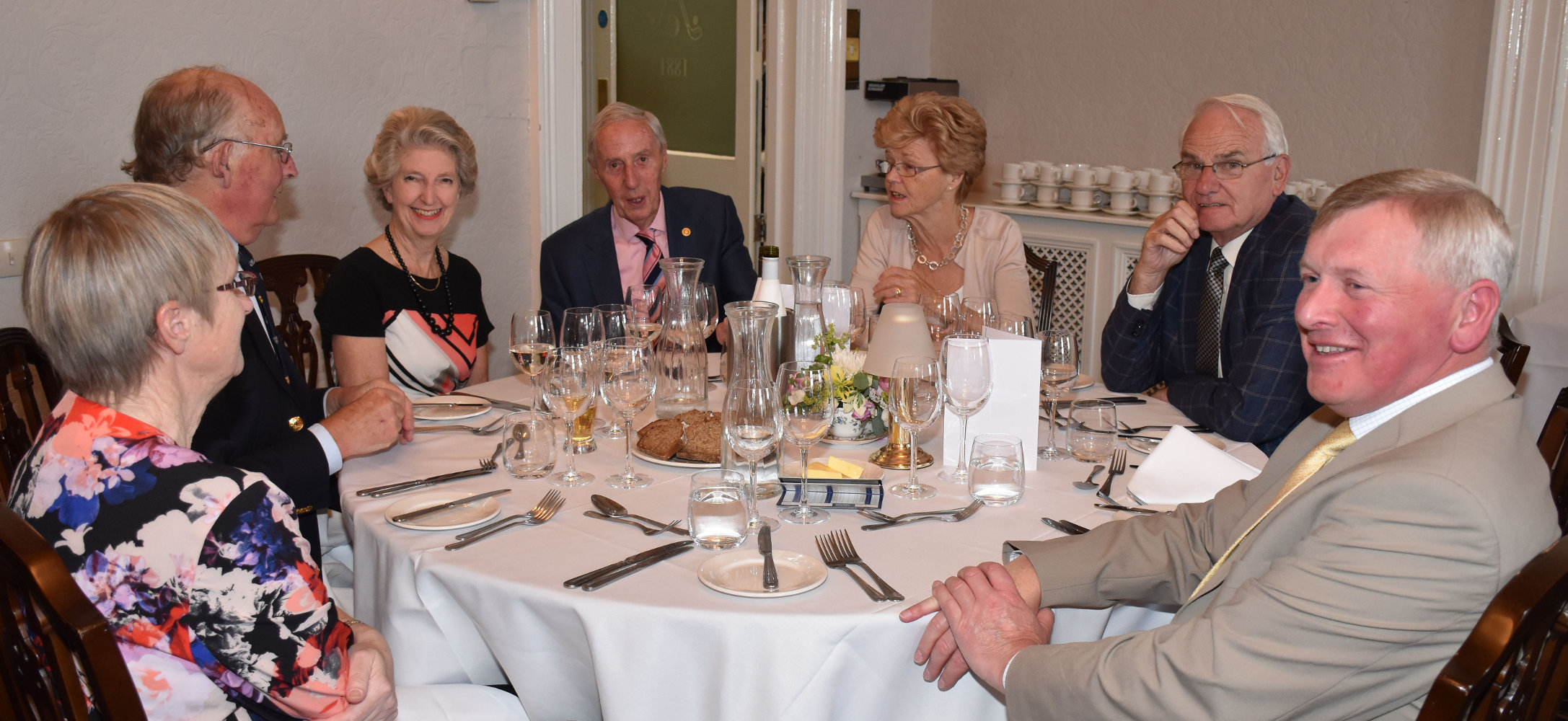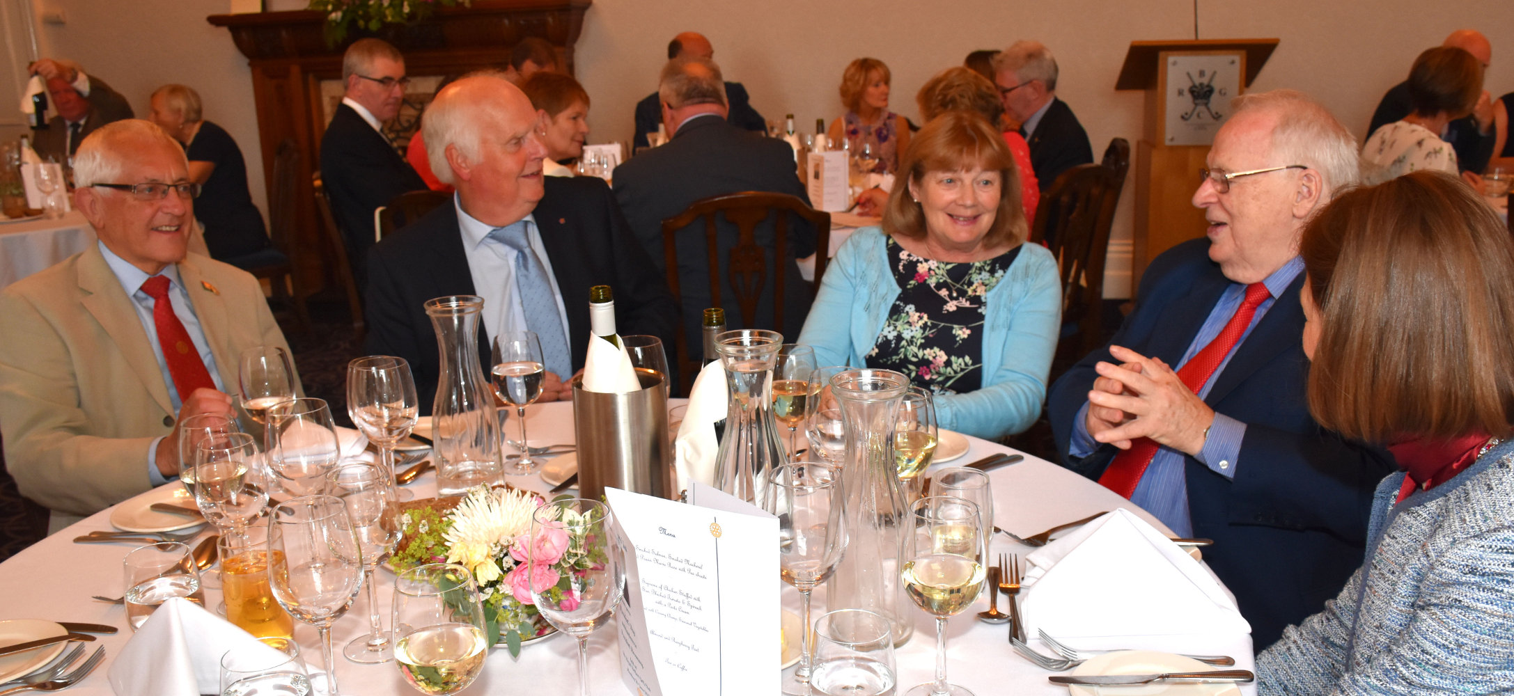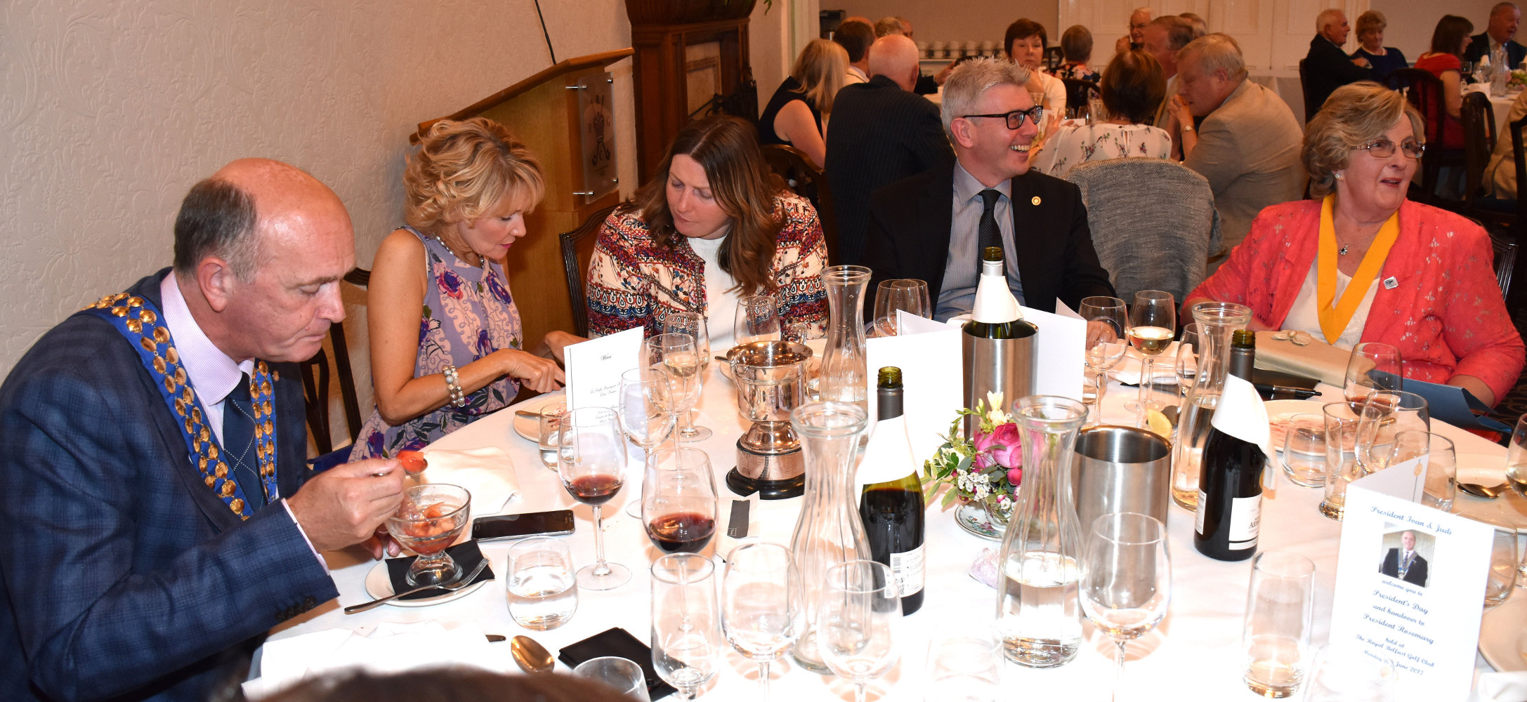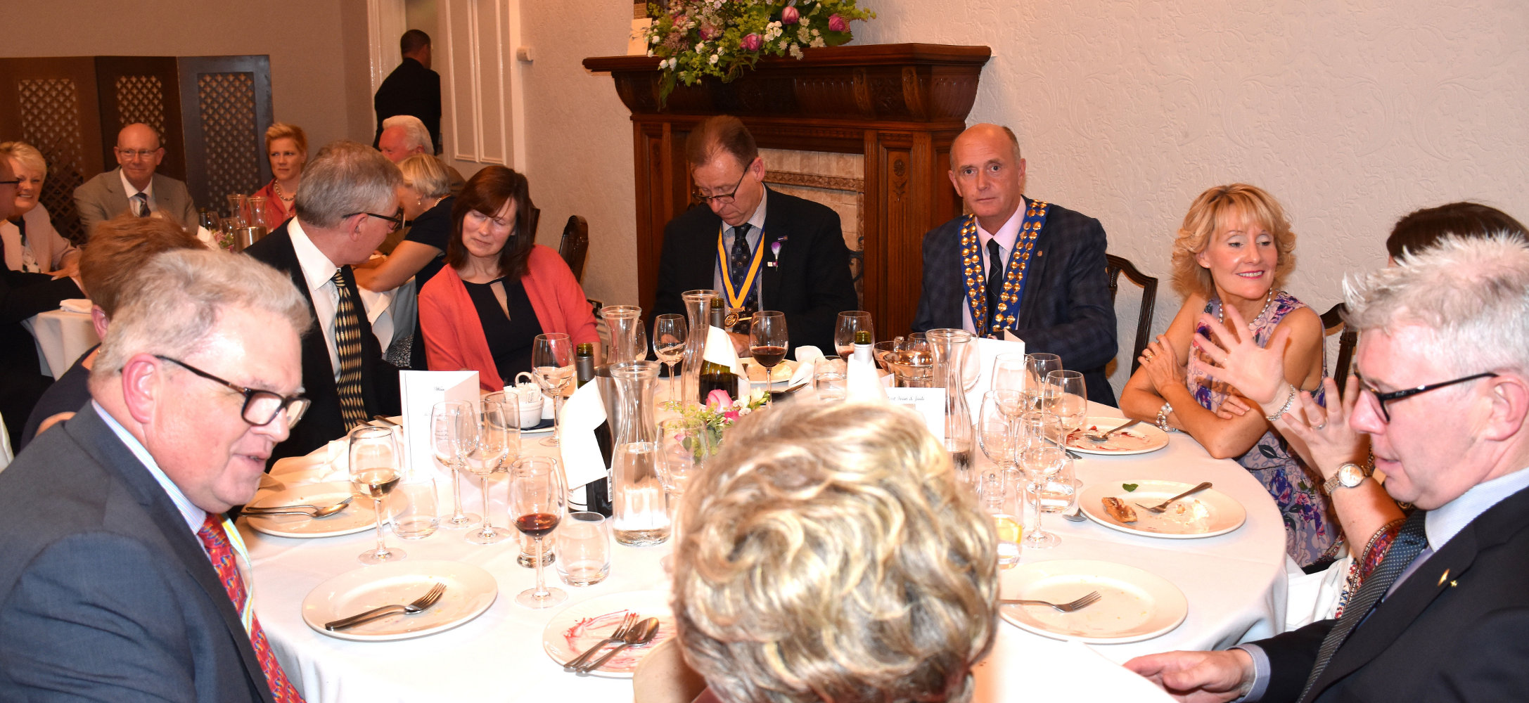 01.TablesGeneralPresident Ivan concluded his year at his President's Dinner held 26 June at the Royal Belfast Golf Club. Always the highlight of the Club's year and this year's extremely convivial evening proved to continue that tradition being greatly enjoyed by the 63 members and guests. After drinks in the bar areas President Ivan welcomed all especially District Governor Elect Garth & Anne Arnold, President Belfast West Rotary Club Des & Jayne McFall President Elect Rosemary's daughter Karen Mbayo and District Assistant Governor Roland Bailie.