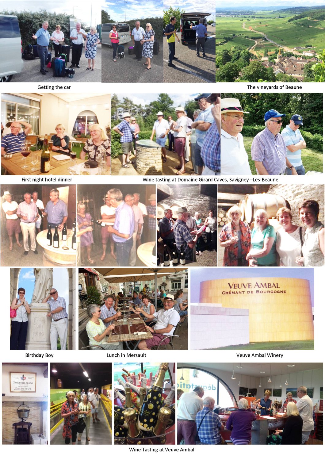There was a relaxing personal choice of activity day on Saturday when most went to the market in the town and visited the Hospices De Beaune and the visit concluded with dinner with Derek & Sandra in a neighbouring village at Le Cellier Volnaysien which also celebrated Hester O'Carrol's birthday. The group departed Sunday evening, some back home and some for an extended visit in France. A montage of other pictures from the visit can be seen right.
