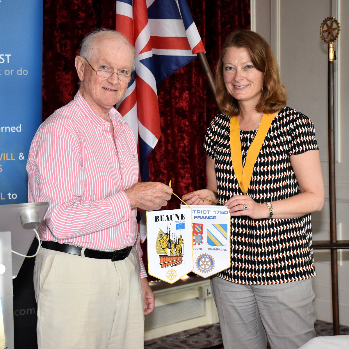 On their return, at the meeting Monday 23 July, Past President Maurice handed over to President Elect Karen Blair the Rotary Club of Beaune and District 1750 banners presented to him. He expressed thanks to former member Derek Forshaw and Sandra for the fantastic programme and welcome they arranged. He also reported a thank you email sent to Derek by Beaune Club President Joel Guevenue noted: Your Irish friends have been great. I had the impression I already knew them, like long-time friends.