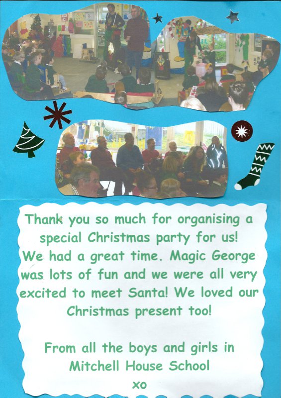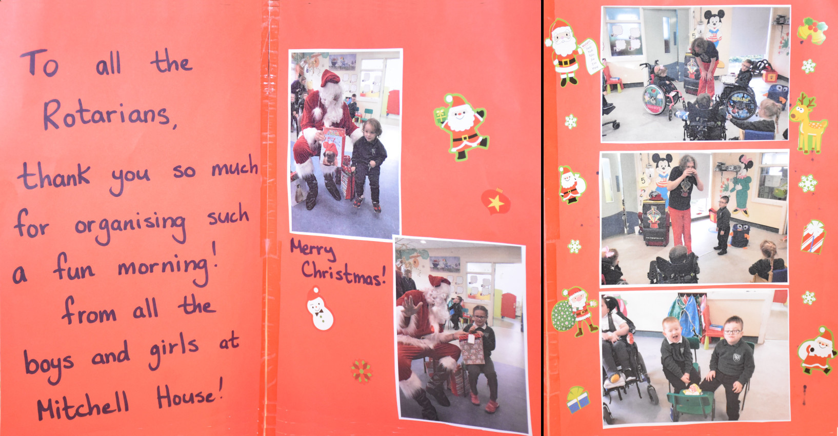 The Club has for the last 20 years provided a Christmas party for the children at the school. Although this party takes on a very familiar format each year, these parties have been very successful, judging by the reaction of the children, and the enthusiasm is contagious. Without being there it is impossible to imagine the wonderful time all those present including the Rotarian 'elves' have and take away special memories and confirmation of how beneficial this project is. The school are very grateful and always compile a "Thank You" Card from all the children. The Club thanks all members who have contributed in any way.