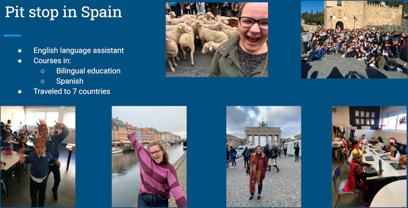 • she then spent a very eye-opening and formative time in Madrid teaching, enjoying the people and culture and travelling to 7 other capitals/countries; this huge experience was capped with earning certificates in bi-lingual education and Spanish and learning the different approach to special needs in Spain