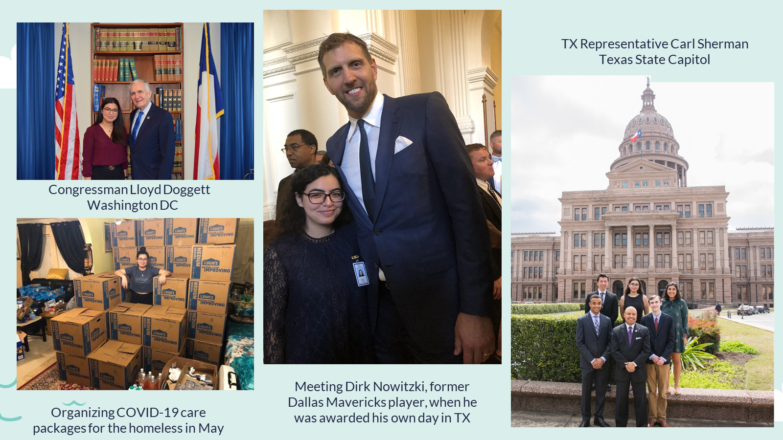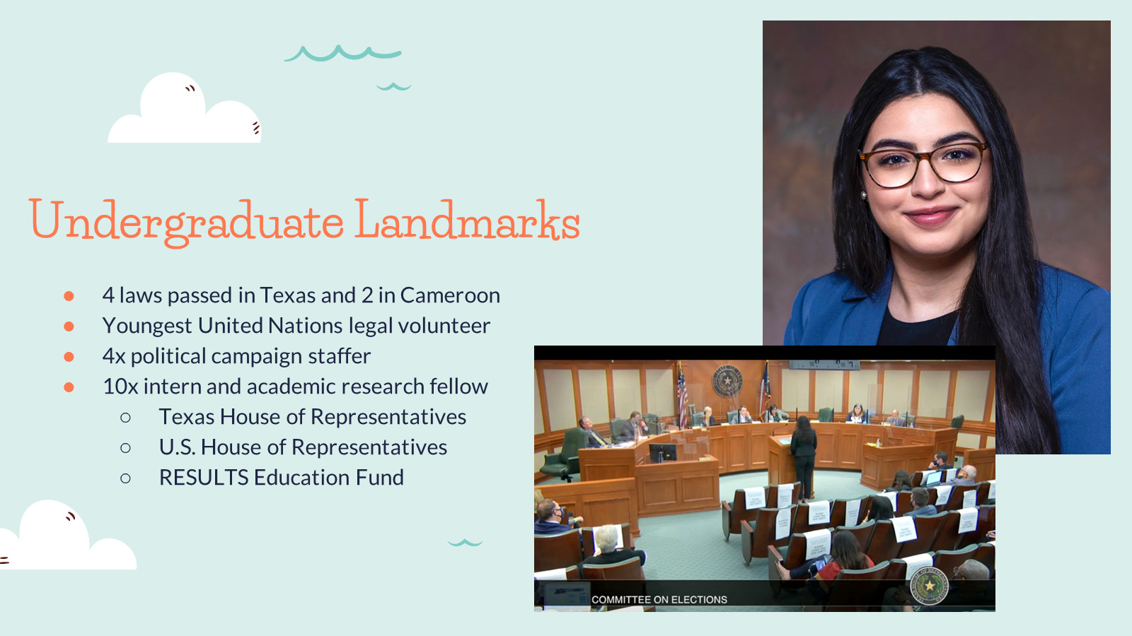 • she went to University in Austin and, as her parents as immigrants could not afford to, she is the first in her family to be a college student; she studied 2 majors - International Business and Business Administration - and was 1 of 10 recipients of a Presidential Award; she was a member of the Student Government and as a Student Ambassador welcomed 1000s of students