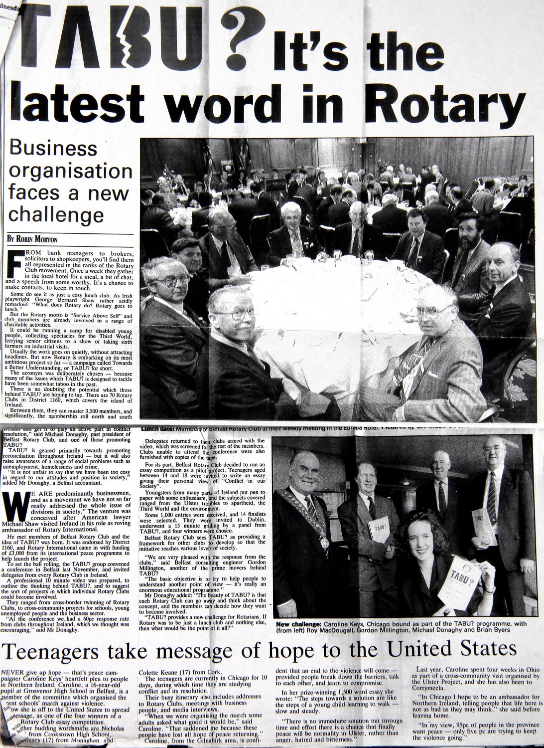 Mike Shaw reported back from his study visit with a list of actions that could be taken by Rotary Clubs to work to a peaceful Ireland. Another chance meeting occurred shortly afterwards at a corporate function before an Arsenal football match in London when PP Gordon, there with PP Bryan Johnston, sat beside NI Secretary of State Brian Mawhinney and related the Club’s work to improving mutual understanding and the proposals being developed. This resulted in access to funding from the Community Relations Council towards the Club’s proposals and, particularly, a video to encourage Rotary Clubs and others to set up their efforts to spread understanding. The Club held a major conference in the RUAS attended by 42 District Clubs where the Belfast Club presented their TABU project - the video being one of the highlights. The video and PR material was also sent to those clubs not present. The TABU logo, Banner and PR material were created for this by Club member John Armstrong and the various projects put forward which included cross-border club twinning and cross community projects for schools, young unemployed and the business sector, had been developed by Toni Thompson who had been employed by the Club under the direction of the MUC.