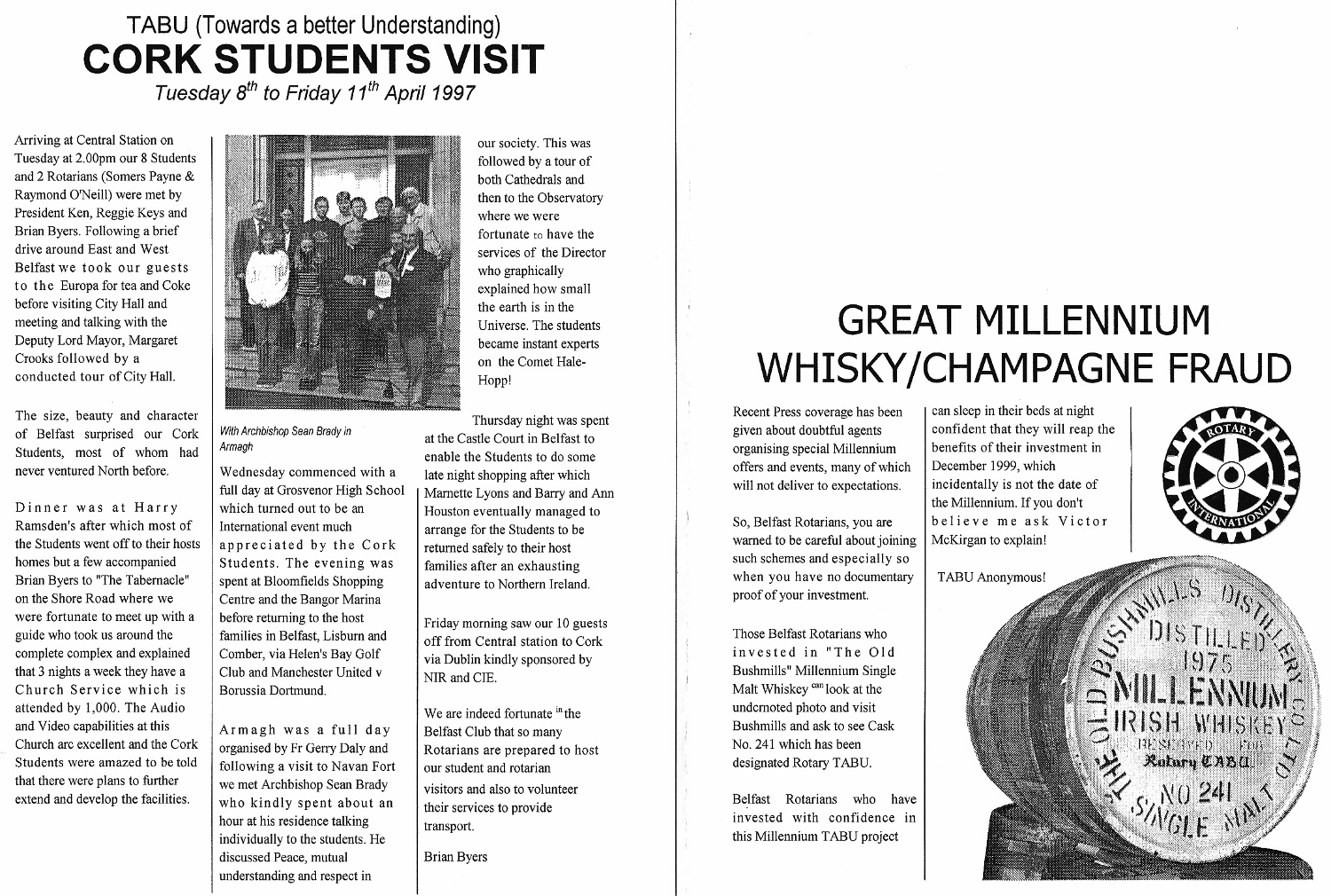 This was the catalyst for an all Ireland pilot TABU project exchange to Highland Park with 4 students being selected by essay selection - there were 1,000 applicants and 14 were interviewed in the Dublin GPO. Other Belfast Club responses he indicated were: a Cork Twinning Exchange (which ran for 5 years) with a Club Millennium Rotary TABU Irish Whiskey Cask and TABU Lady a horse bought by Paul McWilliams, Derek McIlwaine, Gordon Millington and Roy McDougall to bring publicity to the initiative! TABU Lady actually won 4 races, 2 of which being ridden by AP McCoy!