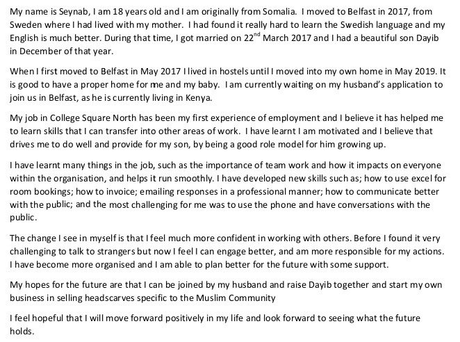 During her visit Amber Rudd also met Seynab Mohamed the Club sponsored YouthAction NI Intern for the period April – September. Having completed her internship she has gained employment post as a Care Assistant and reveals: ‘the change I see in myself is that I feel much more confident in working with others.’ The Club are delighted the programme has led to her employment. Her story, written by her, can be read by clicking on the image.