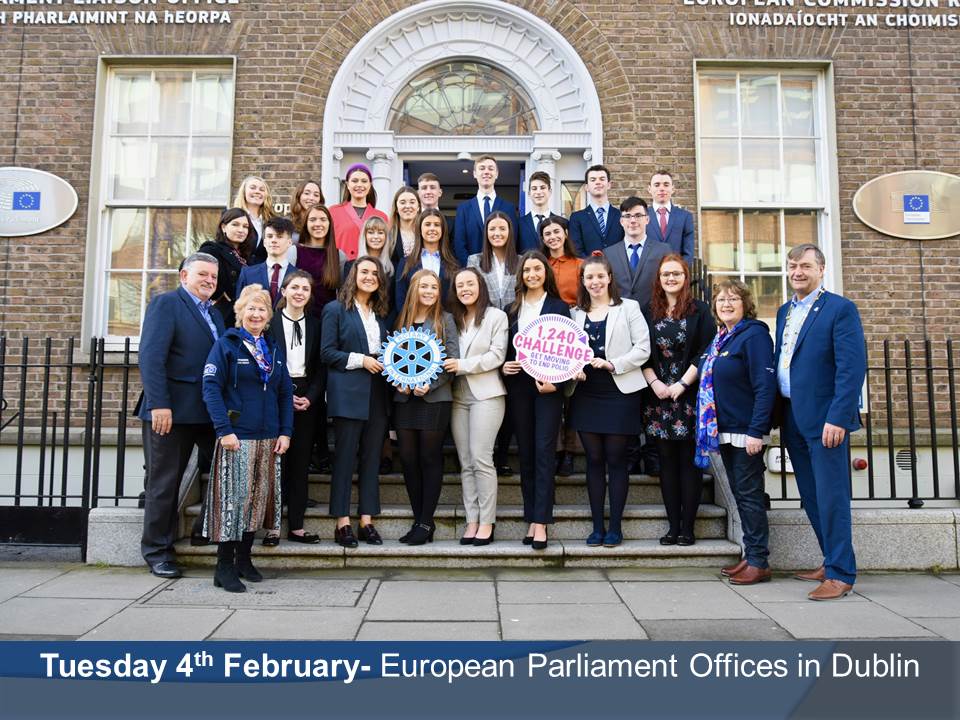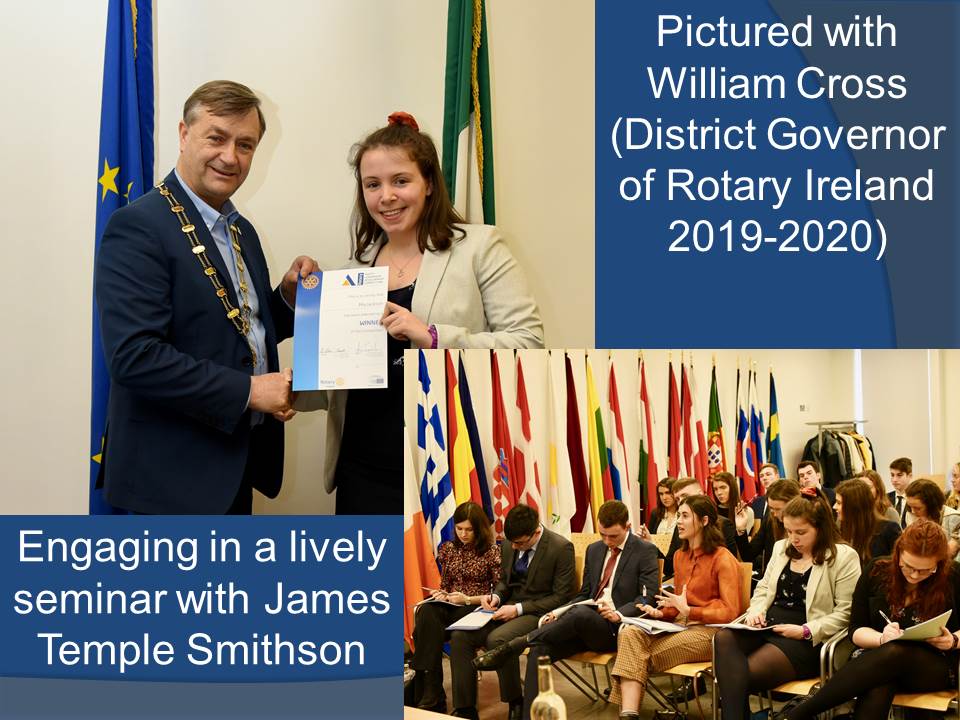 In early October 2019 Mia entered the Rotary Youth Leadership Development Competition and never thought filling out a simple application form would get her to the European Parliament to represent Ireland. She is shown left receiving her certificate from Rotary Ireland District Governor William Cross at the European Parliament office in Dublin.