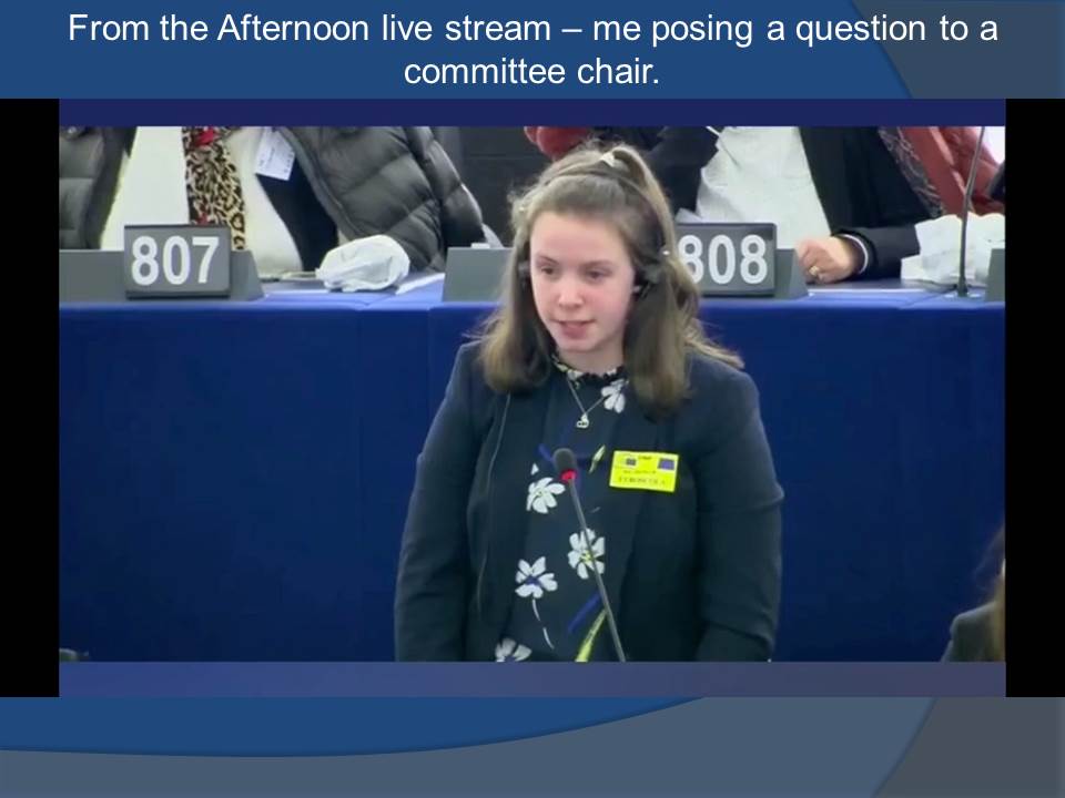 Once we were back in the main chamber and seated alongside the 500 students, we listened to each Chair’s report where I once again persevered to ask a question about one of the topics. Finally I was rewarded and I posed a question to the Migration and Integration Chair about EU funded migration services. I still cannot believe I asked a question in the European Parliament! What made this even better was that only around 30 questions were answered in the entire day! We retired back to the hotel were we enjoyed a lovely Chinese for our last dinner as the Irish Team!